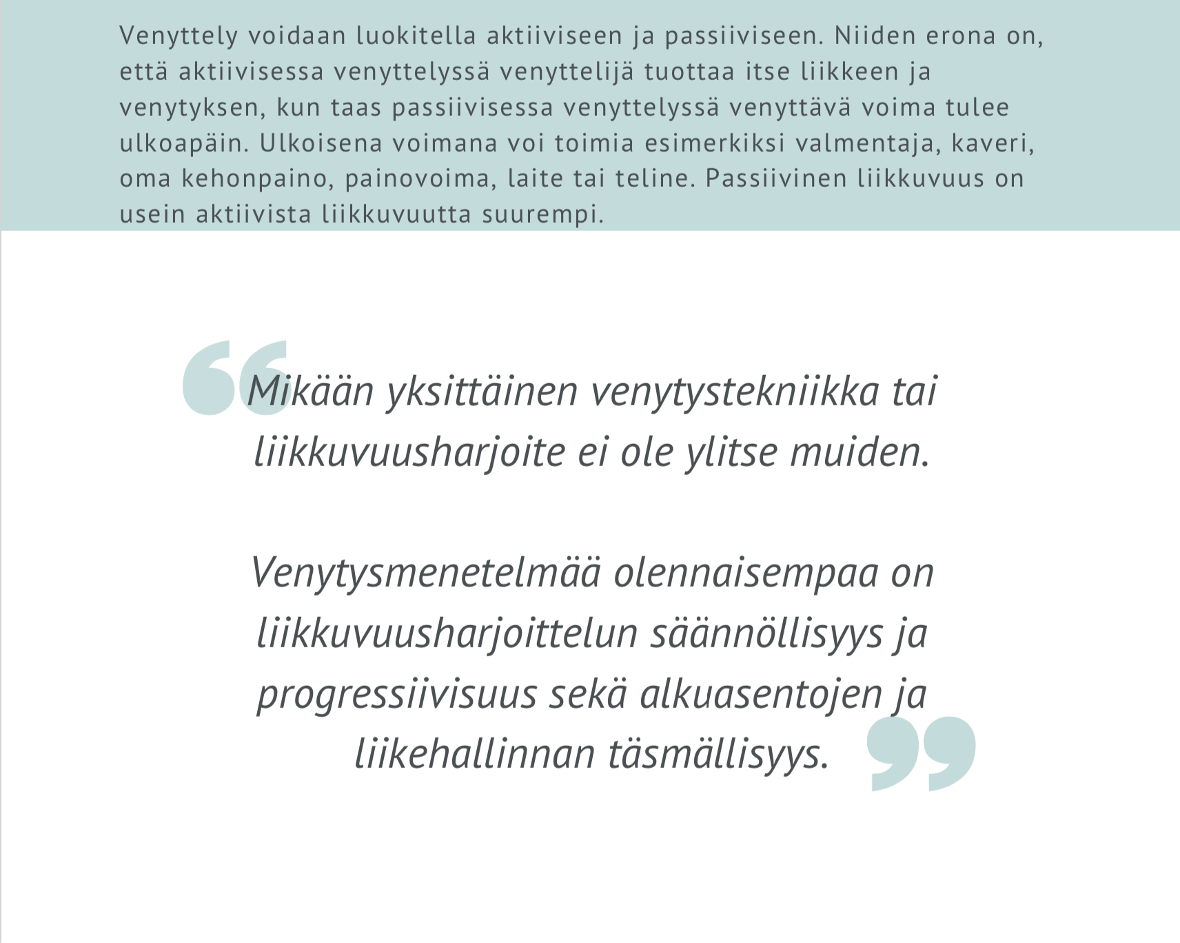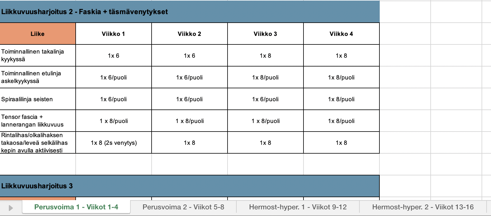 - Ajankäytön vaatimukset: 3 x 60-75 min /vko, jonka lisäksi yksi 20-25 min erillinen liikkuvuusharjoite.