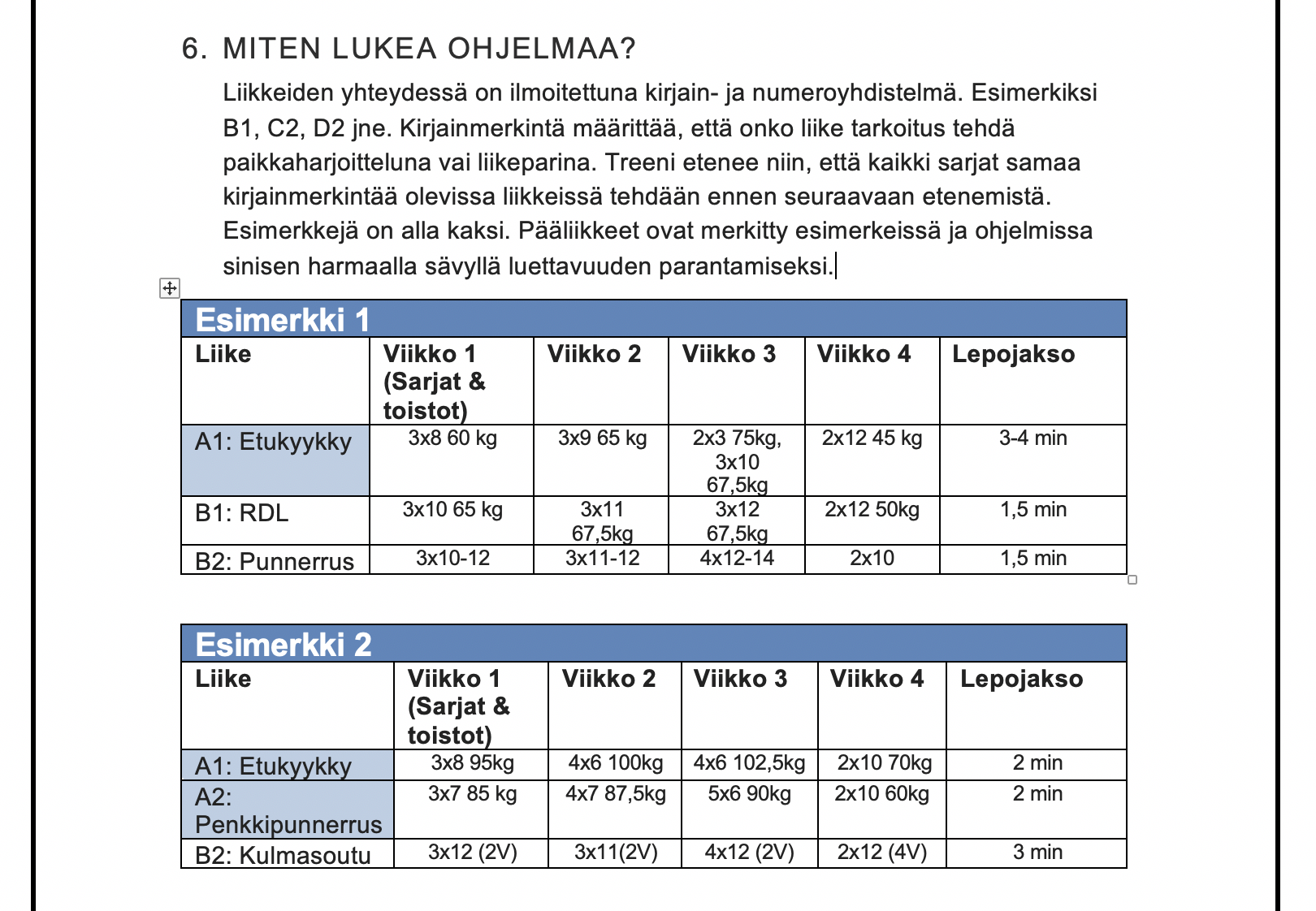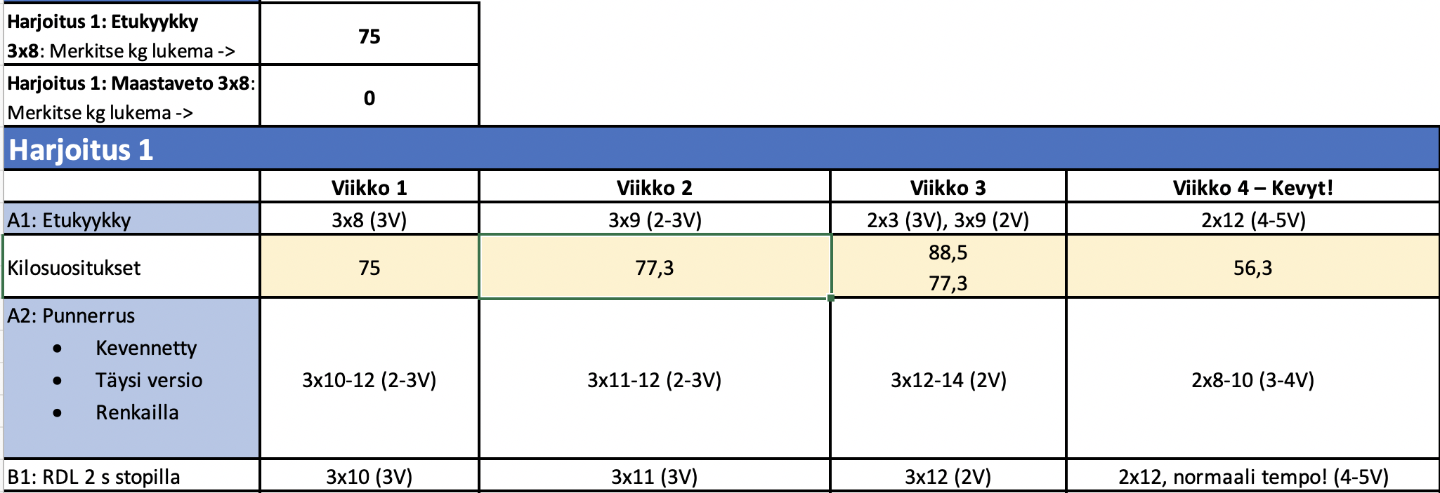 - Excel-harjoitusohjelmapohja, joka antaa toteutuneiden harjoitusten perusteella suositukset pääliikkeiden sarjapainoihin.